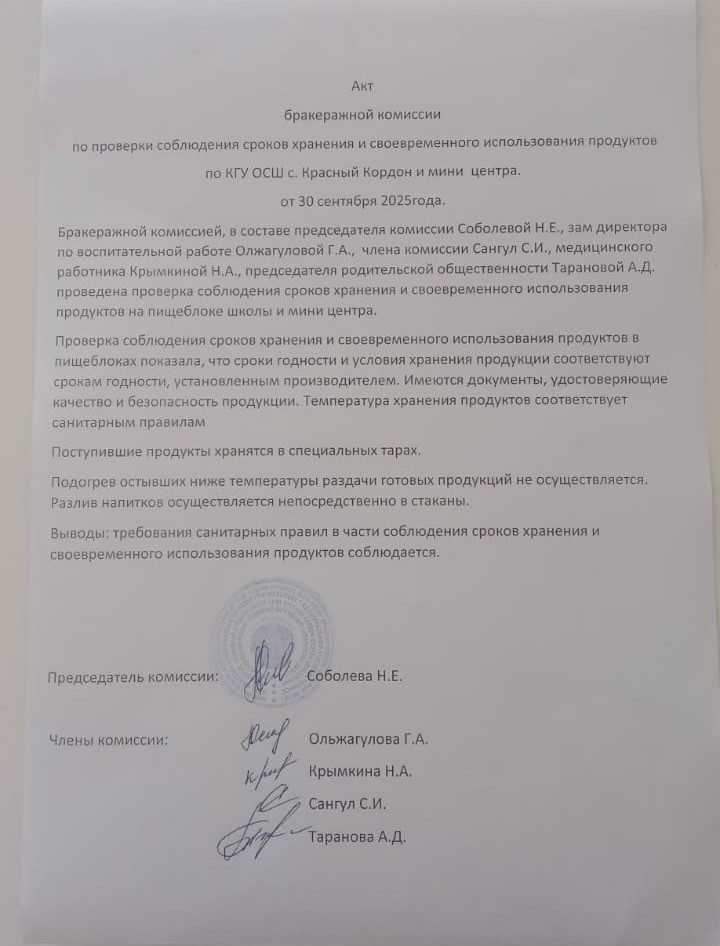 2025 жылғы 30 қыркүйектегі мектеп және шағын орталық бойынша өнімдерді сақтау және уақтылы пайдалану мерзімдерінің сақталуын тексеру жөніндегі бракераж комиссиясының актісі.