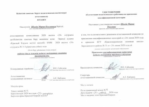 "Педагог-модератор" санатын беруге педагог қызметкерді аттестаттау туралы куәлік 2020 жыл