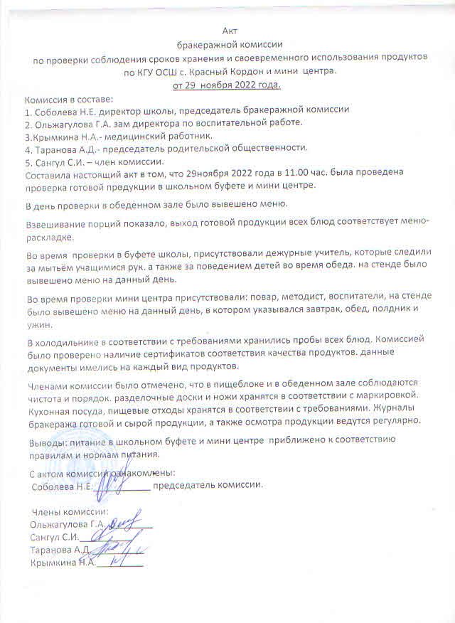 2022 жылғы 29 қарашадағы "Красный Кордон селосының НОМ" КММ және шағын орталық бойынша өнімдерді сақтау және уақтылы пайдалану мерзімдерінің сақталуын тексеру жөніндегі бракераж комиссиясының актісі