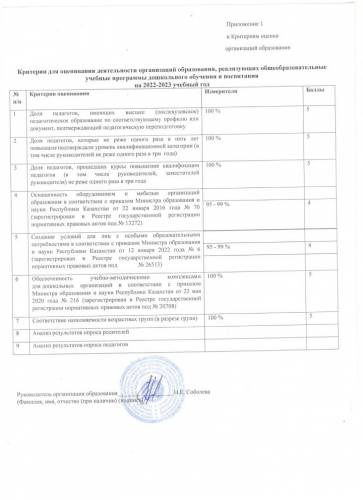 2022-2023 оқу жылына арналған мектепке дейінгі оқыту мен тәрбиелеудің жалпы білім беретін оқу бағдарламаларын іске асыратын білім беру ұйымдарының қызметін бағалауға арналған критерийлер