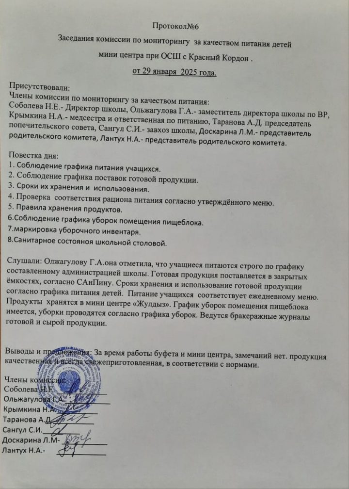 №6 хаттама. 2025 жылғы 29 қаңтардағы Красный Кордон ауылының НОМ жанындағы шағын орталық балаларының тамақтану сапасына мониторинг жүргізу жөніндегі комиссияның отырыстары