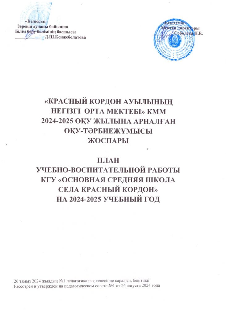 Организация деятельности школы, направленные на выполнение нормативных документов об образовании 5.1 План по реализации Закона РК «О языках в Республике Казахстан» на 2024/2025 учебный год. 5.2 План мероприятий по реализации программы «Цифровой Казахстан» на 2024/2025 учебный год. 5.3 План по обеспечению техники безопасности УВП. 5.4 План работы всеобуча на 2024/2025 учебный год.