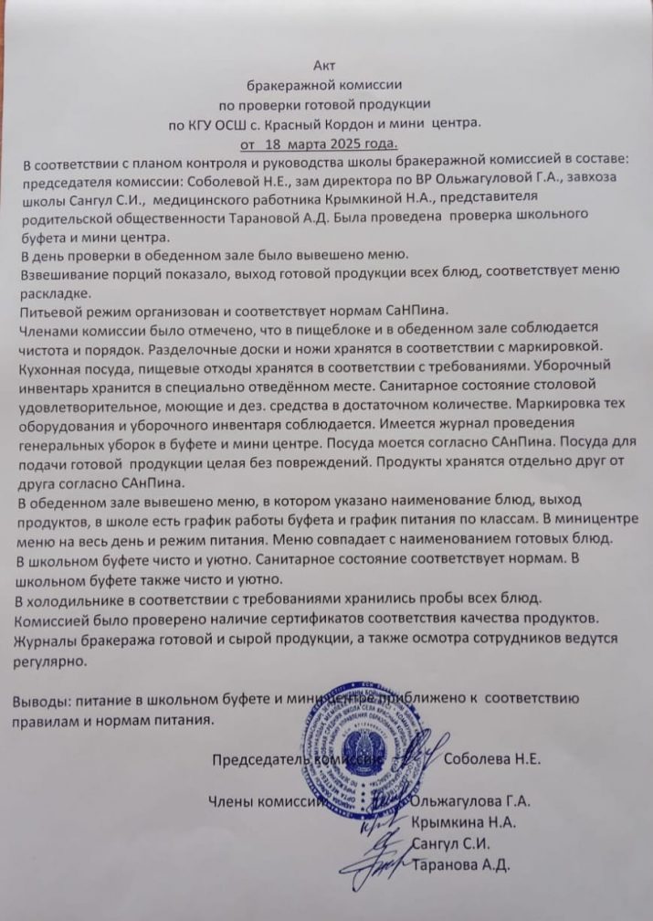 2025 жылғы 18 наурызға арналған "Красный Кордон ауылының НОМ" КММ және шағын орталық бойынша дайын өнімді тексеру жөніндегі бракераж комиссиясының актісі