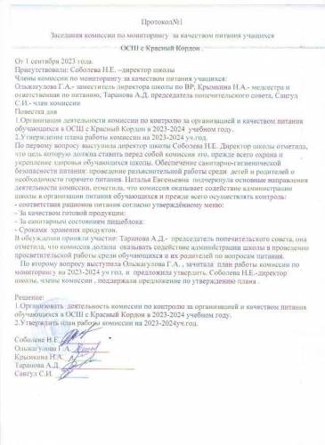 №1 хаттама. 2023 жылғы 1 қыркүйектегі Красный Кордон ауылының НОМ оқушыларының тамақтану сапасына мониторинг жүргізу жөніндегі комиссияның отырыстары