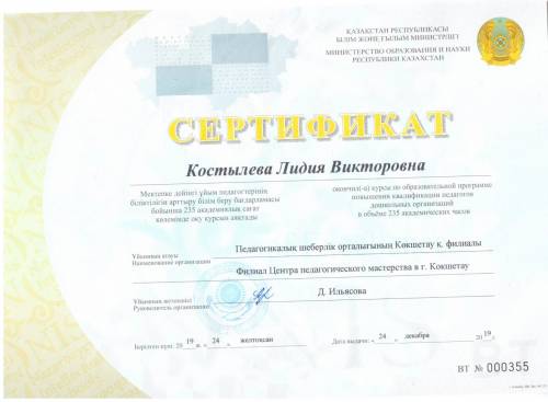 Мектепке дейінгі ұйымдар педагогтерінің біліктілігін арттыру сертификаты, СПМ 2019 жыл