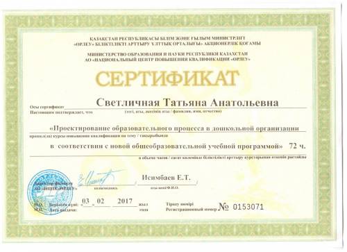 "Жаңа жалпы білім беретін оқу бағдарламасына сәйкес мектепке дейінгі ұйымдағы білім беру процесін жобалау" сертификаты 2017 ЖЫЛ