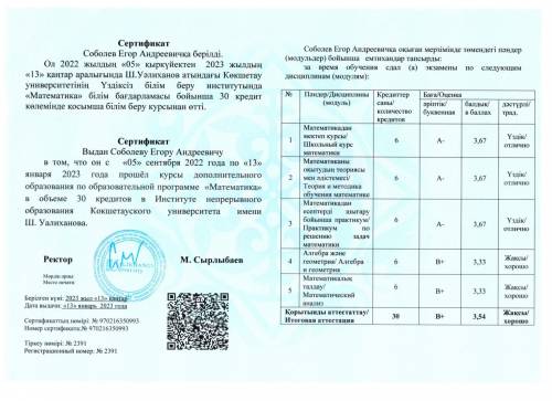 "Математика" білім беру бағдарламасы бойынша қосымша білім беру курстары туралы Сертификат 2022 жыл
