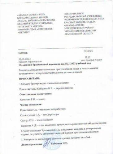 2022-2023 оқу жылына бракераж комиссиясын құру туралы бұйрық