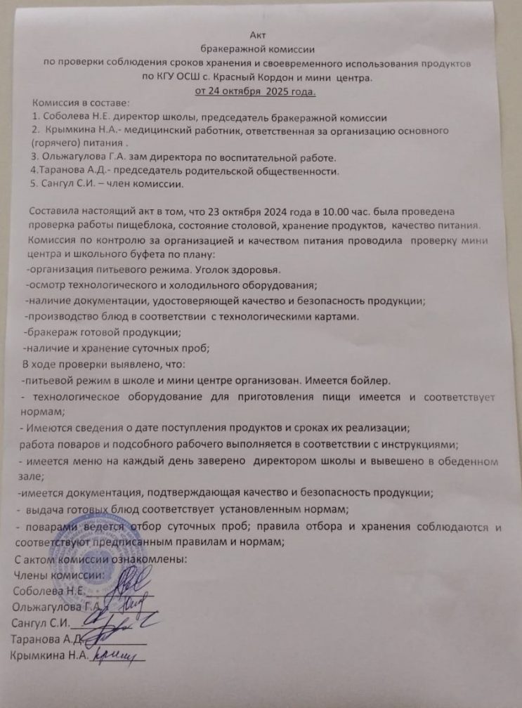 2025 жылғы 24 қазандағы мектеп және шағын орталық бойынша өнімдерді сақтау және уақтылы пайдалану мерзімдерінің сақталуын тексеру жөніндегі бракераж комиссиясының актісі