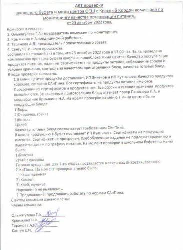 2022 жылғы 23 желтоқсандағы тамақтандыруды ұйымдастыру сапасының мониторингі жөніндегі комиссияның "Красный Кордон селосының орта мектебі" мектеп буфеті мен шағын орталығын тексеру актісі
