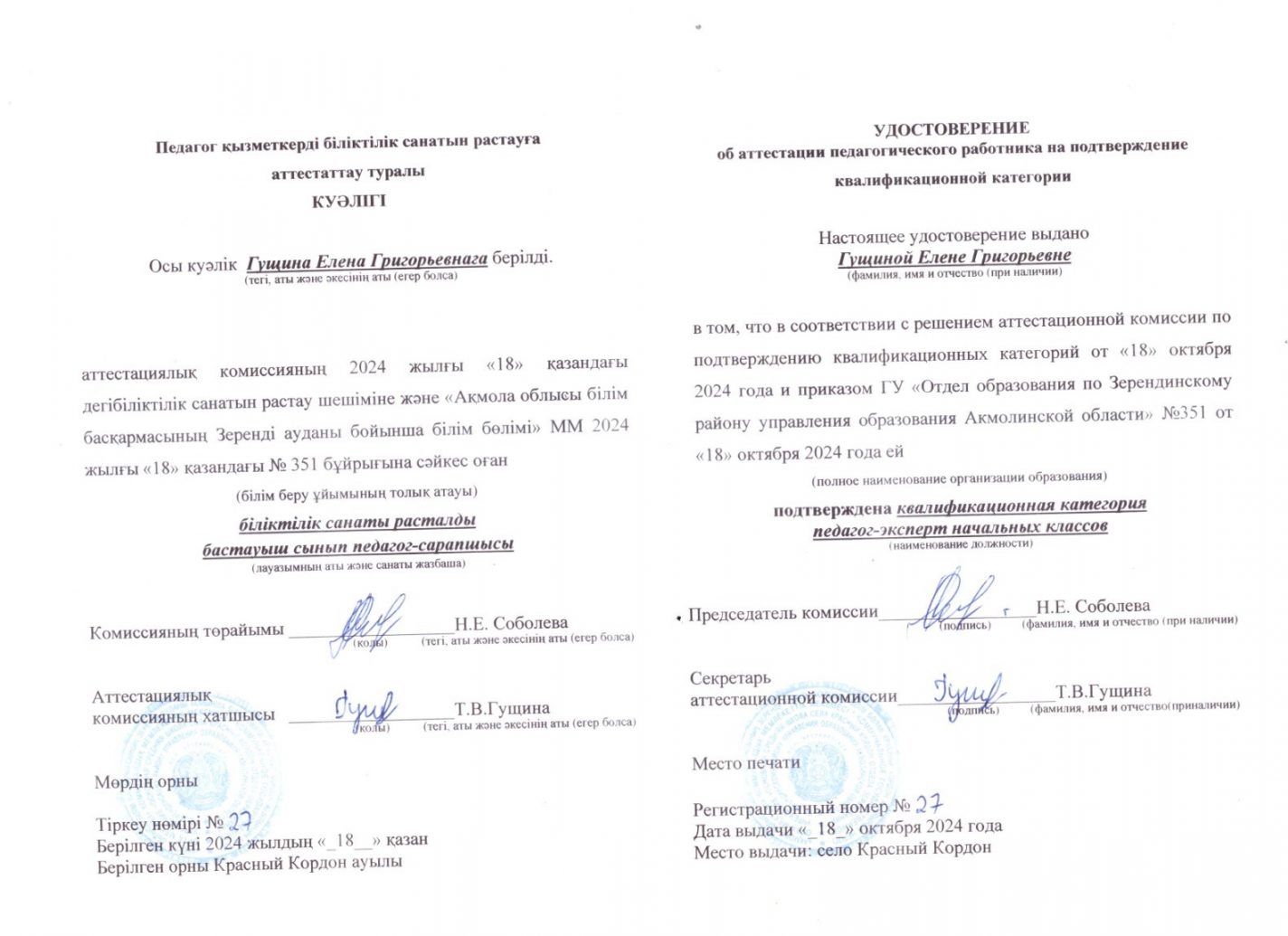 Бастауыш сыныптардың педагог-сарапшысы біліктілік санатын растауға педагог қызметкерді аттестаттау туралы куәлік 2024 жыл