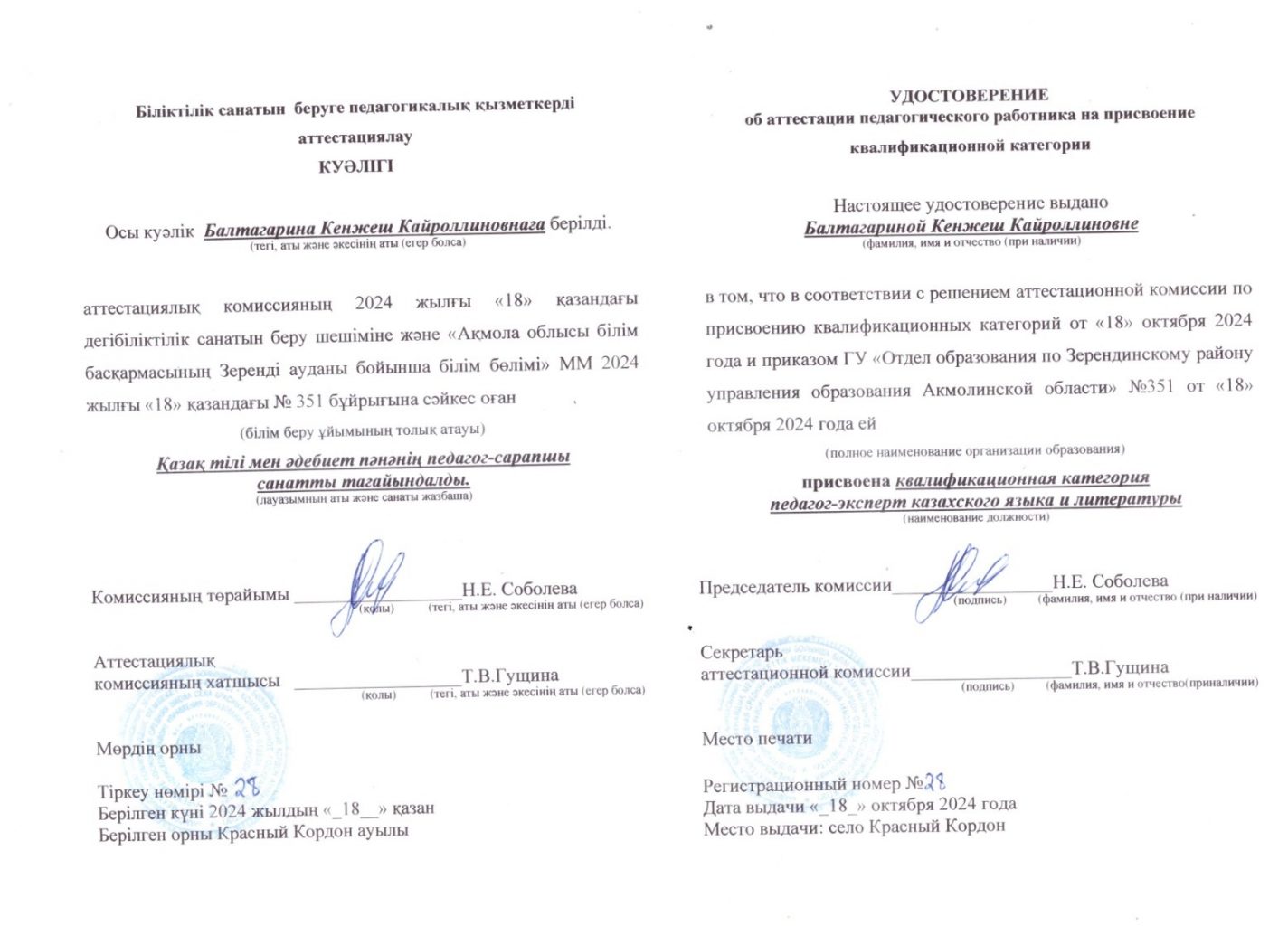 Педагог қызметкерге қазақ тілі мен әдебиеті педагог-сарапшысы біліктілік санатын беруге арналған куәлік 2024 жыл