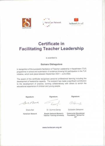 Сертификат "Certificate Teacher Leadership" 2021-2022 год