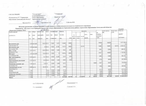 "Жұлдыз" шағын орталығының әкімшілік-шаруашылық, оқу-көмекші және техникалық персоналының 2021 жылғы 1 қыркүйектегі штат кестесі