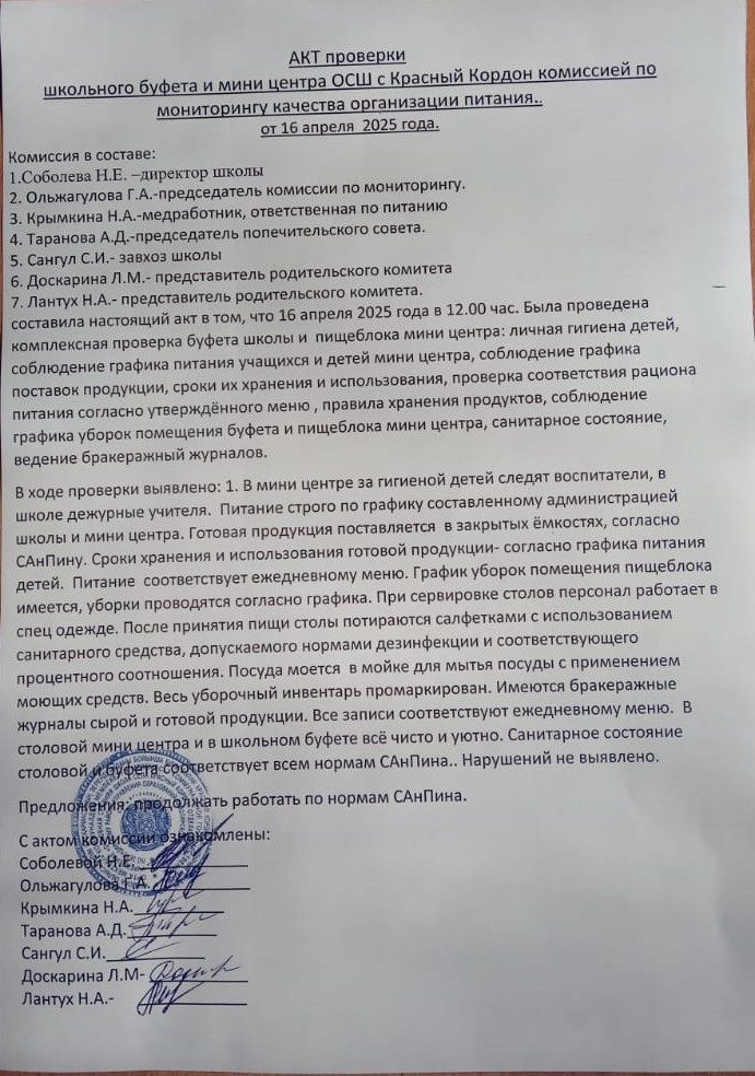 2025 жылғы 16 сәуірдегі тамақтандыруды ұйымдастыру сапасының мониторингі жөніндегі комиссияның "Красный Кордон ауылының НОМ" мектеп буфеті мен шағын орталығын тексеру актісі