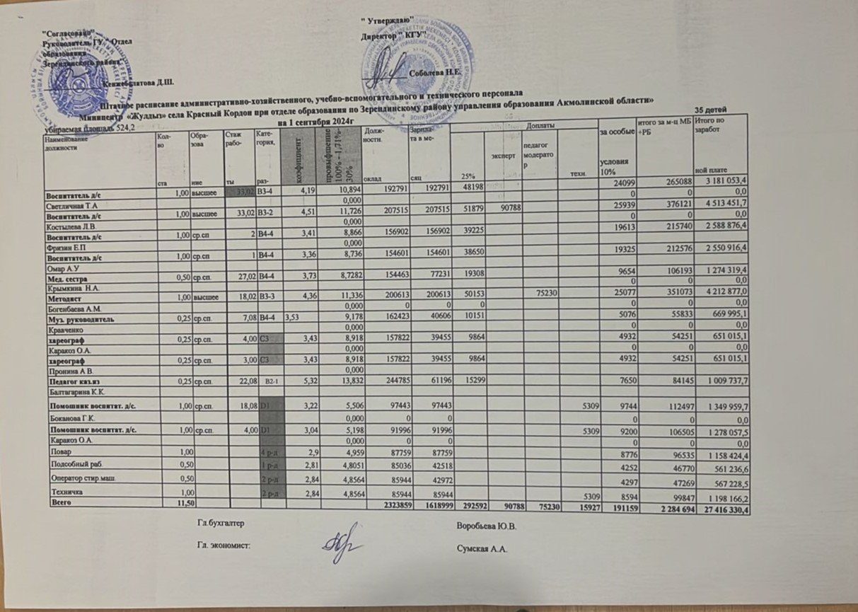 "Жұлдыз" шағын орталығының әкімшілік-шаруашылық, оқу-көмекші және техникалық персоналының 2024 жылғы 1 қыркүйектегі штат кестесі