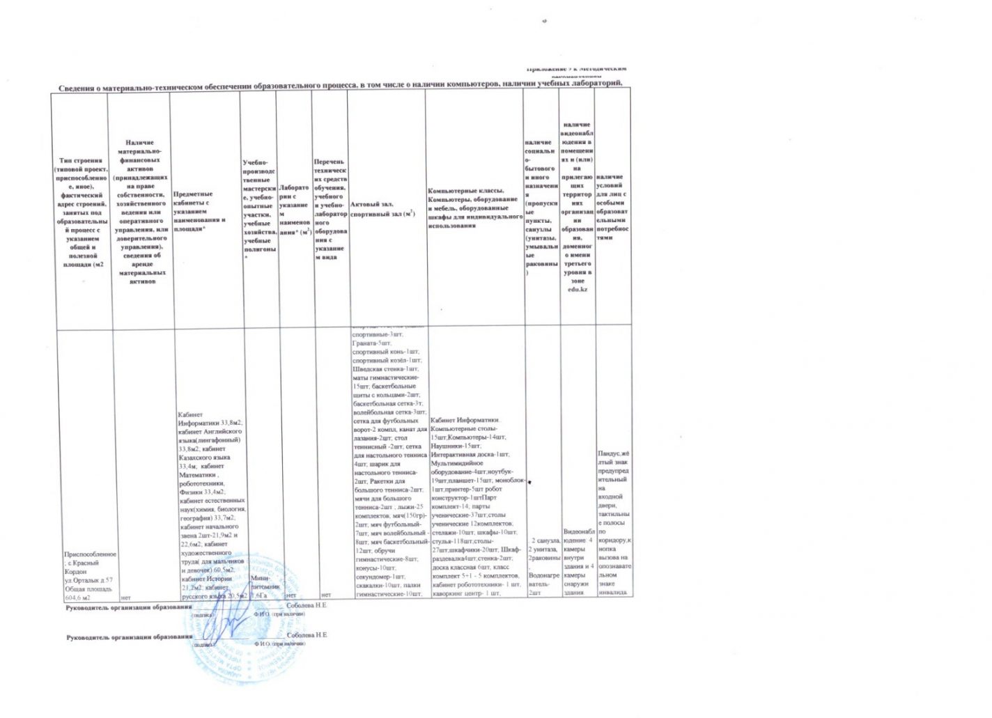 Білім беру үдерісін материалдық-техникалық қамтамасыз ету туралы, оның ішінде компьютерлердің болуы, оқу зертханаларының, оқу пәндік кабинеттерінің және "Красный Кордон селосының орта мектебі" КММ Оқытудың техникалық құралдарының болуы туралы мәліметтер (01.06.2025ж)