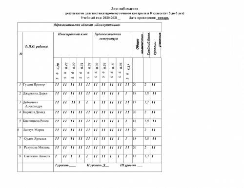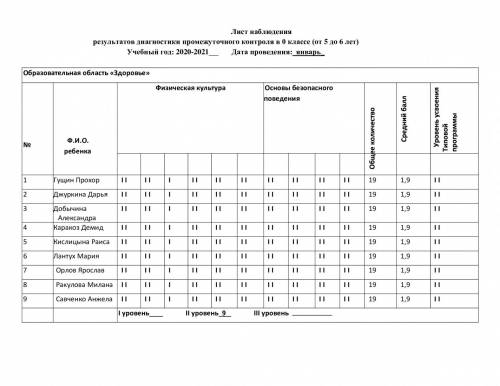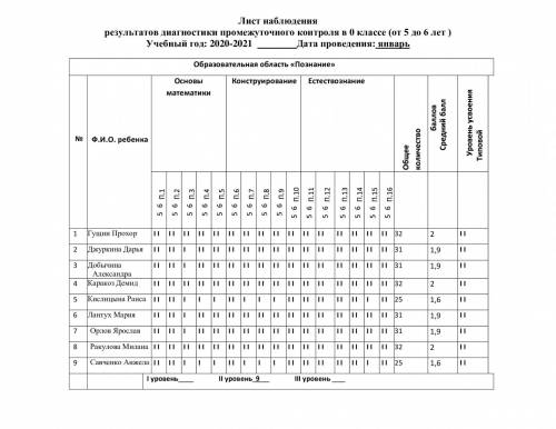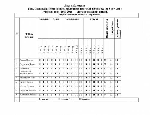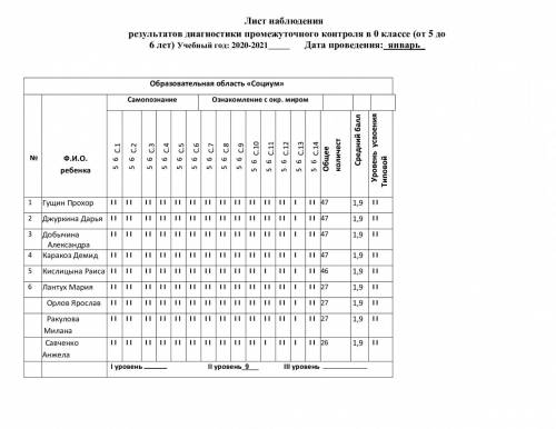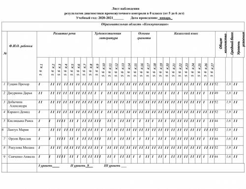 Бақылау парағы 0-сыныптағы аралық бақылау диагностикасының нәтижелері (5 жастан 6 жасқа дейін) Оқу жылы: 2020-2021