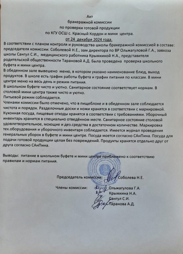 24.12.2024 ж."Красный Кордон аулының НОМ" және шағын орталық КММ бойынша дайын өнімді тексеру жөніндегі бракераж комиссиясының актісі