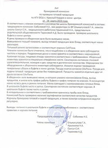 Красный Кордон а. НОМ КММ және шағын орталық бойынша дайын өнімді тексеру жөніндегі бракераж комиссиясының 2023 жылғы 28 наурыздағы актісі