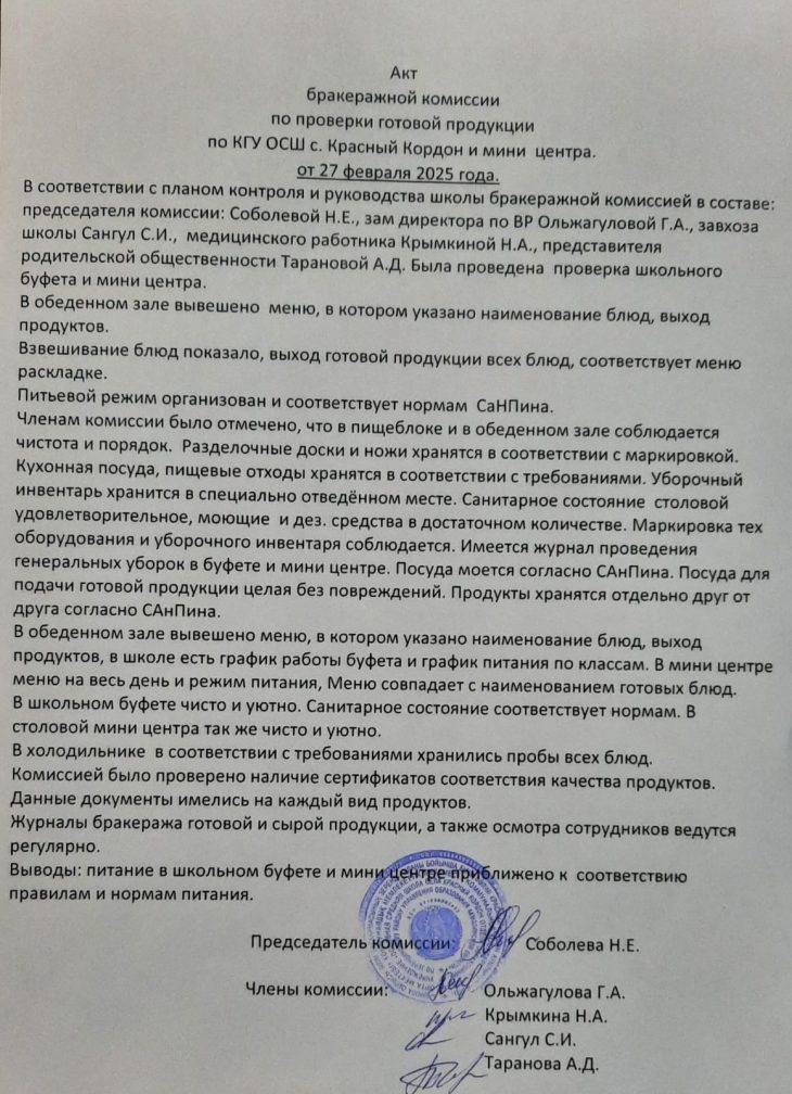 Мектеп және шағын орталық бойынша дайын өнімді тексеру жөніндегі бракераж комиссиясының 27.02.2025 ж. актісі