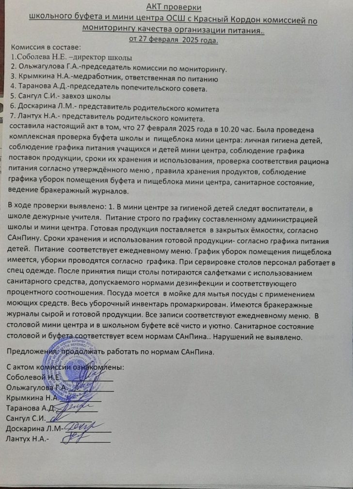 2025 жылғы 27 ақпандағы тамақтандыруды ұйымдастыру сапасының мониторингі жөніндегі комиссияның мектеп буфеті мен шағын орталығын тексеру актісі
