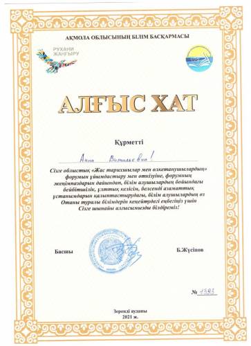 "Жас тарихшылар мен өлкетанушылар"форумына қатысқаны үшін алғыс хат 2021