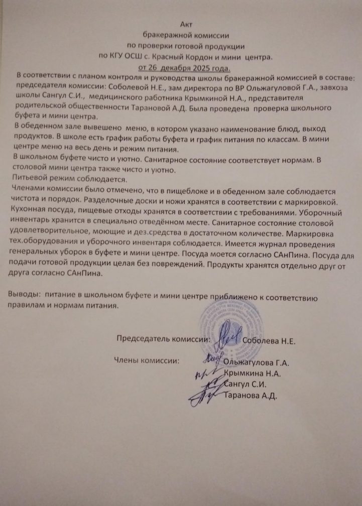 Желтоқсан. Мектеп пен шағын орталық бойынша өнімдерді сақтау және уақтылы пайдалану мерзімдерінің сақталуын тексеру жөніндегі бракераж комиссиясының актісі.