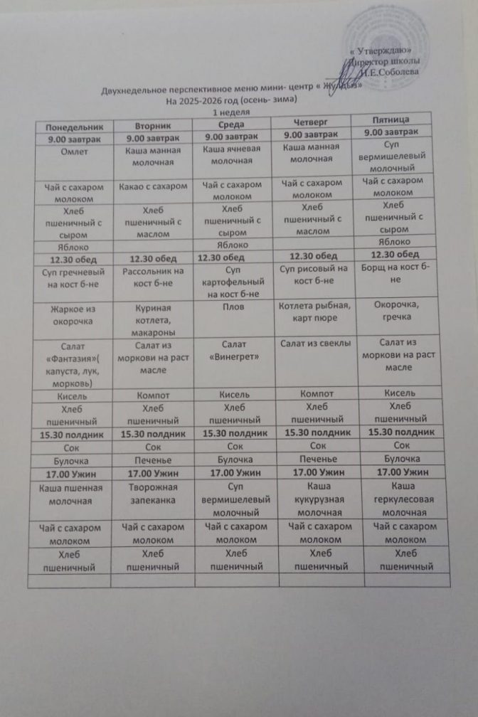 2025-2026 жылдарға арналған "Жұлдыз" шағын орталығының екі апталық перспективалық мәзірі (күз-қыс)
