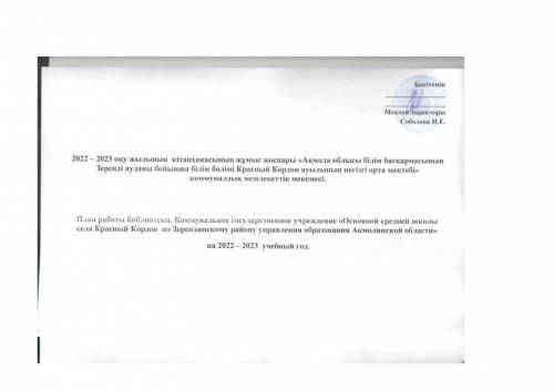 План работы библиотеки. Коммунальное государственное учреждение «Основной средней школы села Красный Кордон по Зерендинскому району управления образования Акмолинской области» на 2022 – 2023 уч.г.