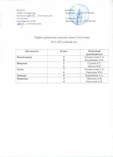 2021-2022 оқу жылы 0-ден 9-сыныпқа дейінгі сынып сағаттарын өткізу кестесі