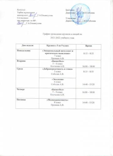 Үйірмелер мен секцияларды өткізу кестесі 2021-2022 оқу жылы