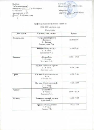 Үйірмелер мен секцияларды өткізу кестесі 2022-2023 оқу жылы (2 жартыжылдық)