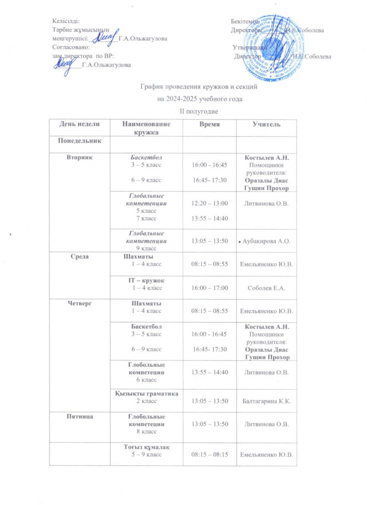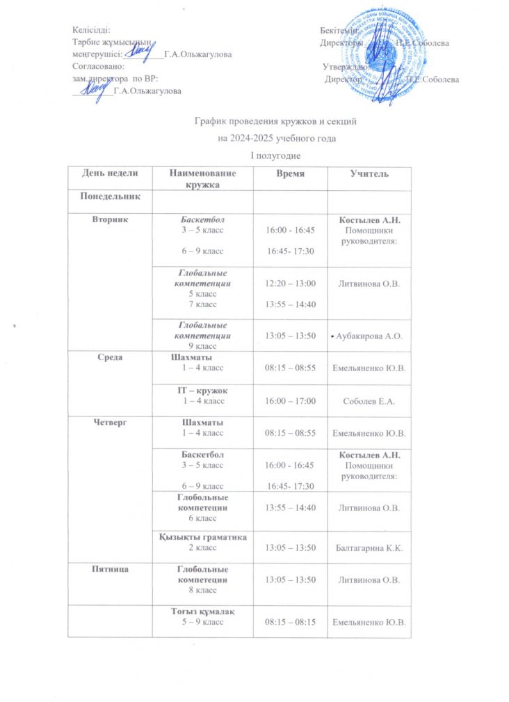 2024-2025 оқу жылына арналған үйірмелер мен секцияларды өткізу кестесі