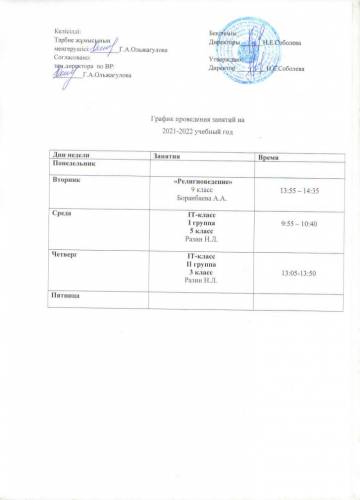 2021-2022 оқу жылына арналған сабақтарды өткізу кестесі