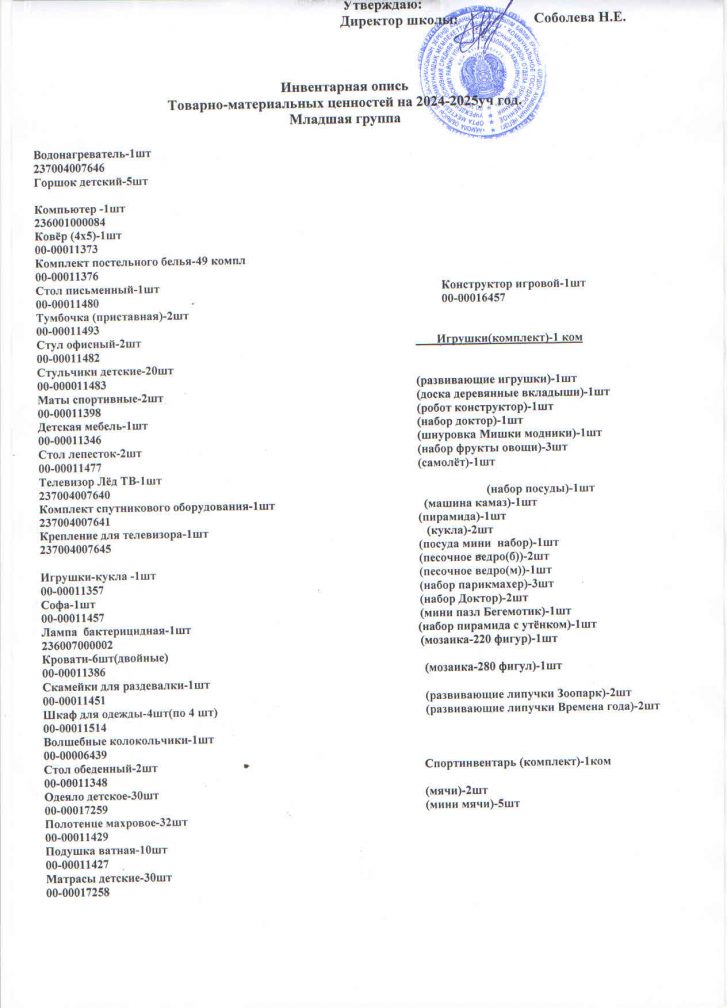 2024-2025 оқу жылына арналған тауарлық-материалдық құндылықтардың түгендеу тізімдемесі. Кіші топ