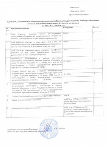 2021-2022 оқу жылына арналған мектепке дейінгі оқыту мен тәрбиелеудің жалпы білім беретін оқу бағдарламаларын іске асыратын білім беру ұйымдарының қызметін бағалауға арналған критерийлер