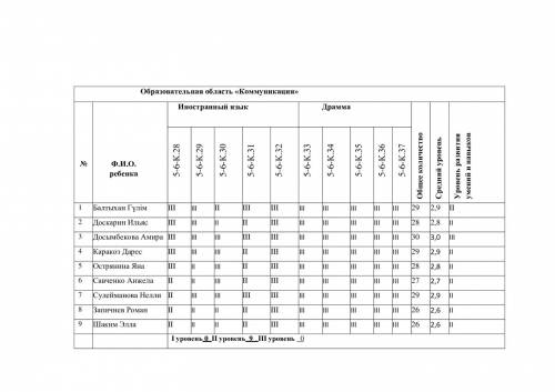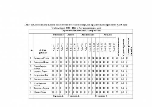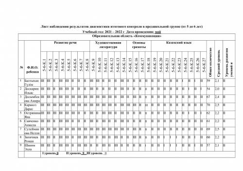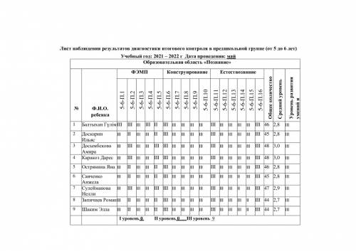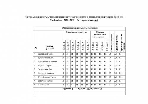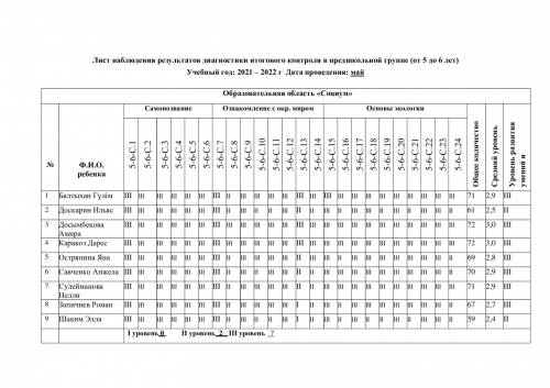 Мектепалды топтағы қорытынды бақылау диагностикасының нәтижелерін бақылау парағы (5 жастан 6 жасқа дейін) Оқу жылы: 2021-2022 ж