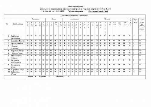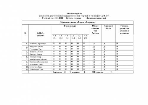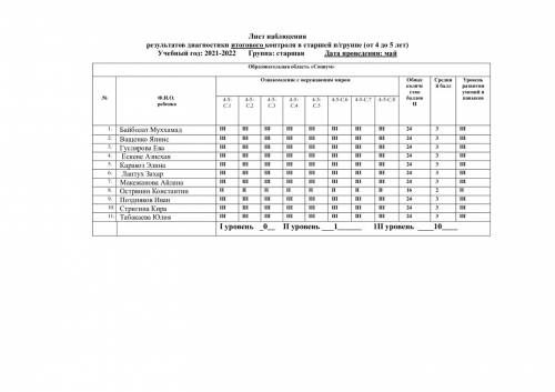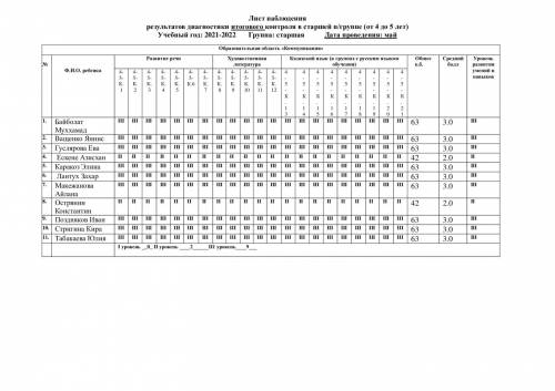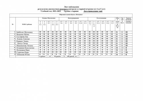Бақылау парағы аға топтағы қорытынды бақылау диагностикасының нәтижелері (4 жастан 5 жасқа дейін) Оқу жылы: 2021-2022