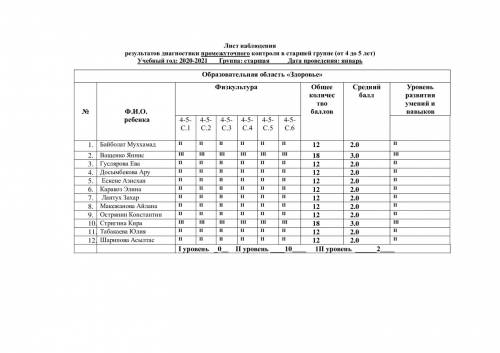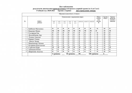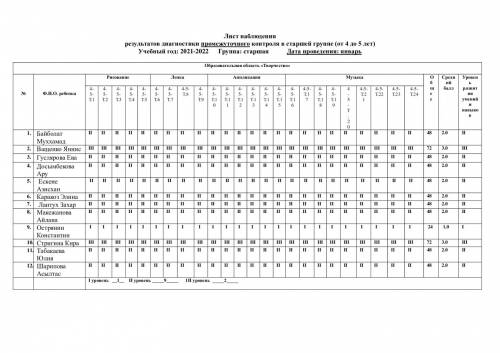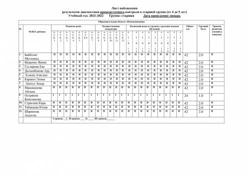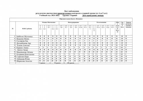 Аға топтағы аралық бақылау диагностикасының нәтижелерін бақылау парағы (4 жастан 5 жасқа дейін) оқу жылы: 2021-2022