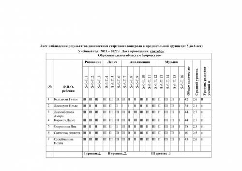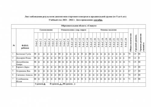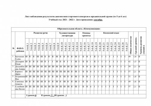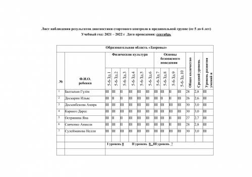 Мектепалды топтағы бастапқы бақылау диагностикасының нәтижелерін бақылау парағы (5 жастан 6 жасқа дейін) оқу жылы: 2021 – 2022 ж