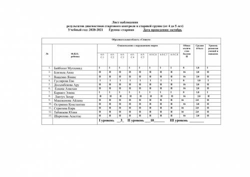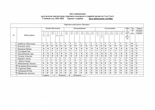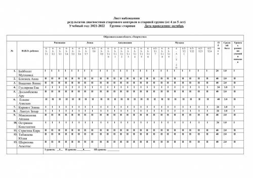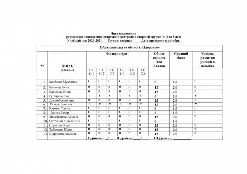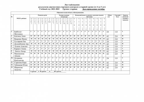 Бақылау парағы топтағы бастапқы бақылау диагностикасының нәтижелері (4 жастан 5 жасқа дейін) Оқу жылы: 2021-2022