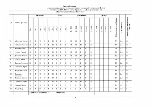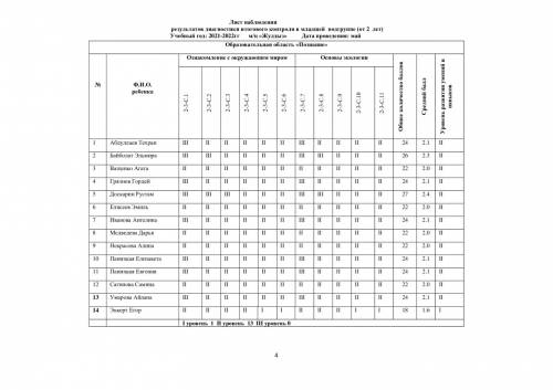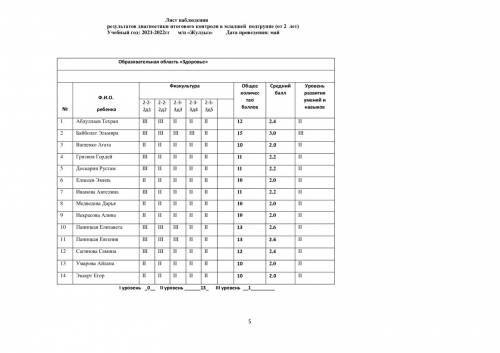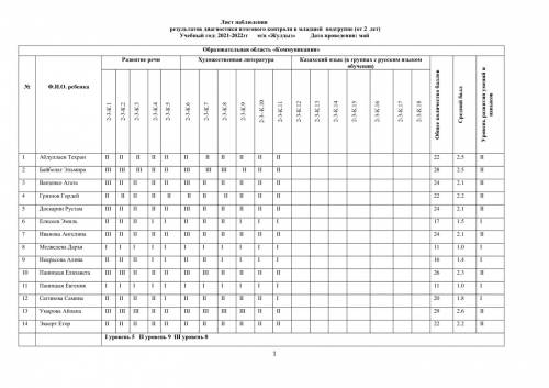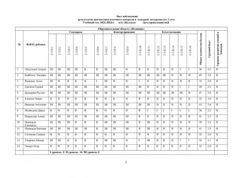 Бақылау парағы кіші топтағы қорытынды бақылау диагностикасының нәтижелері (2 жастан бастап) Оқу жылы: 2021-2022ж