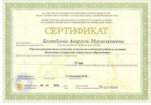 Мектепке дейінгі білім беру мазмұнын жаңарту жағдайындағы әдістемелік жұмыстың ұйымдастырушылық-педагогикалық аспектілері. "ӨРЛЕУ" АО НЦПК 2020 жыл