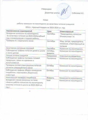 Тамақтану сапасының мониторингі жөніндегі комиссияның 2023-2024 оқу жылына арналған жұмыс жоспары