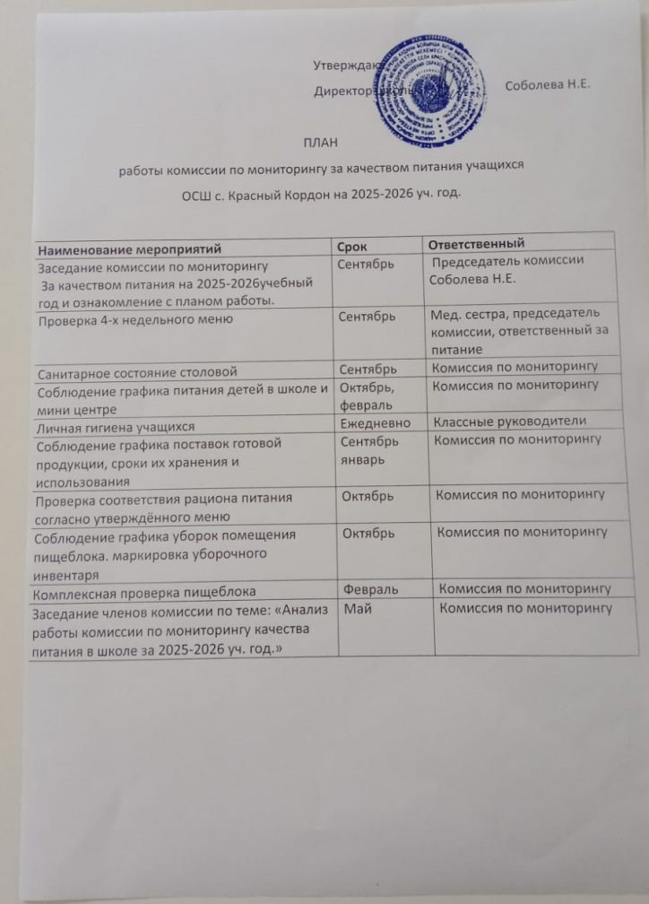 Мектеп оқушыларының тамақтану сапасына мониторинг жүргізу жөніндегі комиссияның 2025-2026 оқу жылына арналған жұмыс жоспары