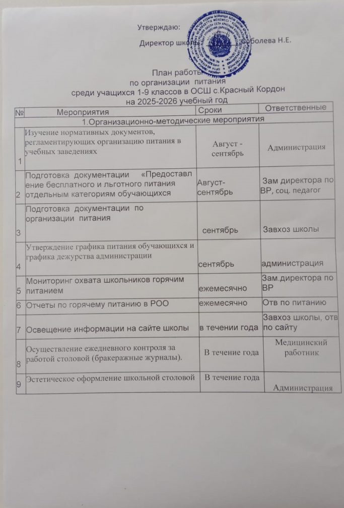 2025-2026 оқу жылына арналған 1-9 сынып оқушылары арасында тамақтануды ұйымдастыру бойынша жұмыс жоспары