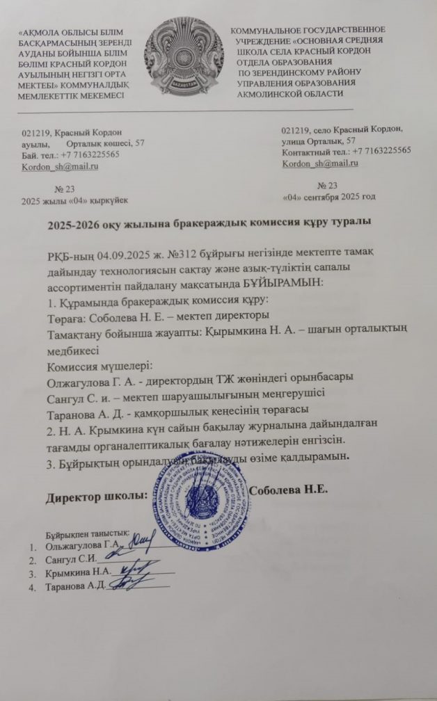 2025-2026 оқу жылына бракераж комиссиясын құру туралы бұйрық