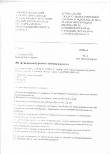 2021-2022 оқу жылына "мектепте буфеттік тамақтандыруды ұйымдастыру туралы" бұйрық