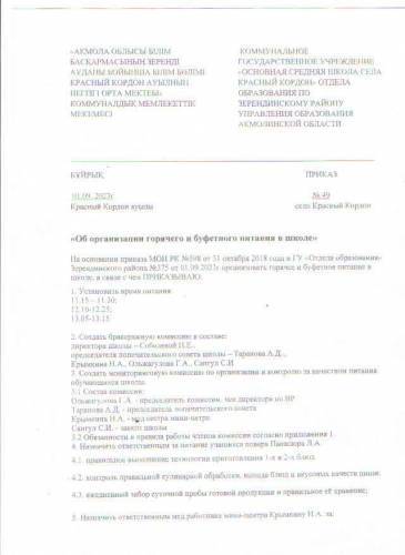 2023-2024 оқу жылына арналған "Мектепте ыстық және буфеттік тамақтануды ұйымдастыру туралы" бұйрық